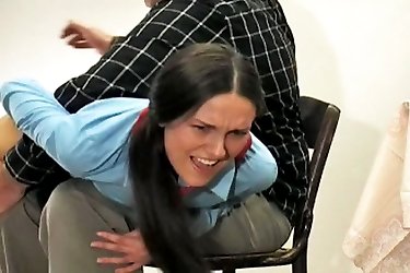 Charlie has disobeyed her teacher yet again and is called into the headmasters office to be disciplined. The headmaster pulls her across his lap, lifts up her skirt and proceeds to give her a good old-fashioned spanking. After a few swats of his hand, t